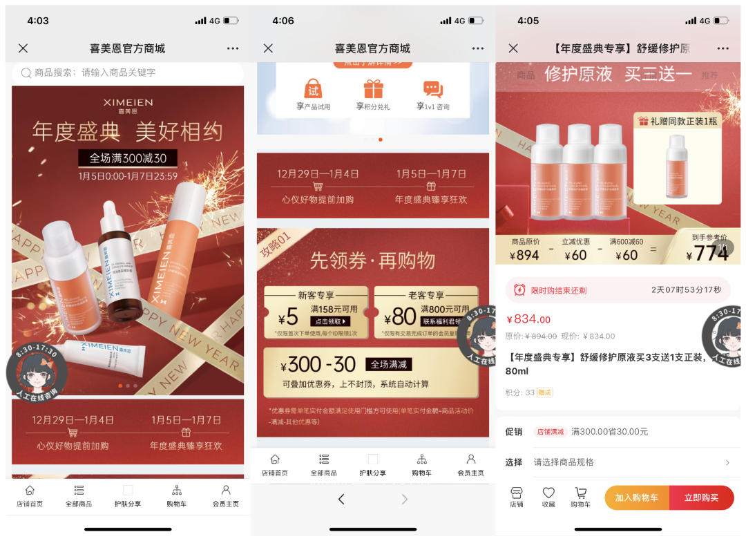 喜美恩适逢年末上新年货节大促营销活动,商城内会上线特惠福利给到消费者,如“满减”、“买赠”等营销活动。